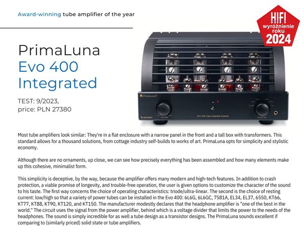 Read morePrimaLuna EVO 400 Tube Integrated Amplifier wins Hi-Fi Muzyka "Product Of The Year 2024" Award